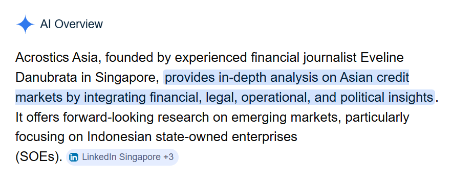 For example, Google AI Overview optimizes for relevance by assessing factors such as the quality of content and industry recognition. In short, Acrostics Asia’s focus on quality is aligned with what AI is looking for.